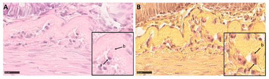 HE (A) and phloxine tartrazine (B) stained sections showing intestinal eosinophilic granule cells within the granulosum layers of submucosa (a—nucleus; b—eosinophilic granular cytoplasm).