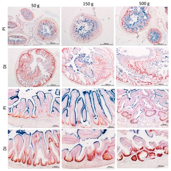 Quantitative data were expressed as mean ± SD. Results were analyzed by using One-way or Two-way analysis of variance (ANOVA) followed by all-pairwise multiple comparison test with the Holm–Sidak method. The two independent variables considered (animal weight and intestinal tract) were independent of each other, and there was no relationship between the observation in each group or between the groups themselves. Dependent variables considered (mucosa volume, goblet cells number and vacuoles volume and goblet cells producing acid, neutral and a mixed combination of them) were normally distributed according to the Shapiro–Wilk normality test. The homogeneity of variance was assessed through Bartlett’s test. Differences were considered statistically significant if p < 0.05.