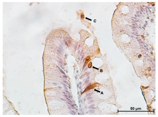 We identified eosinophilic granule cells (EGCs) within the submucosa granular layers. in agreement with previous observations in the Salmo salar [26]. EGC are considered the functional equivalent of Paneth cells and indeed, EGCs found in Rainbow trout were positive to Phloxine-tartrazine staining that is specific for Paneth cells. They play a pivotal role in intestinal mucosa defense by secreting antimicrobic peptides and in intestinal stem cells regulation [27]. However, their position outside the epithelium is not compatible with that of bona fidae Paneth cells. Recent data report that the stratum granulosum hosts numerous eosinophilic mast cells involved in the inflammatory process [28], so that some authors simply consider eosinophilic granule cells to be mast cells [29]. Our data do not support this conclusion because rainbow trout ECG did not contain alkaline phosphatase nor peroxidase as opposed to mast cells described in fish.