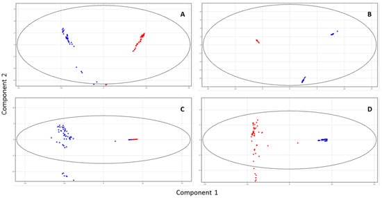 Principal components analysis (PCA) scores plots of the LC–MS data acquired for the four milk samplings from pregnant (in red) and non-pregnant (in blue) buffaloes. (A) (first sampling): PC1 occupies 69.37% and PC2 7.42% of total variance; (B) (second sampling): PC1 72.26% and PC2 27.23%; (C) (third sampling): PC1 61.45% and PC2 7.04%; and (D) (fourth sampling): PC1 79.85% and PC2 2.83%.