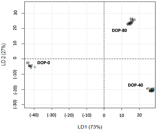 We performed a discriminant analysis to quantify the contribution of each variable to the differences observed among the three treatments. Since the number of variables analysed is very large, only those variables that were significantly different (p < 0.05) according to a permutation ANOVA test were selected in the model. The resulting model was used to identify the key variables that contribute to the differences in the meat suckling kid goats based on meat quality parameters, FA profile, and volatile compound content. Function 1 of the discriminant analysis accounted for 72.9% of the total variation among feeding strategies and it was mainly determined by the absence (DOP-0) or presence of DOP in goat feed (DOP-40 and DOP-80). This function clearly discriminated the effect of including DOP in goat feed, with meat from goats fed using DOP on the right and meat from goats fed with concentrate without DOP on the left. The parameters of colour L*, a*, and hue angle determined the variability assigned to LD1 (Table 3).