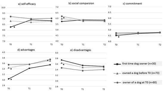 Changes over time for (a) self-efficacy, (b) social comparison, (c) commitment, (d) advantages, and (e) disadvantages in the three dog owning history groups. An asterix (* placed below the line) indicates a significant increase or decline between the two time points.