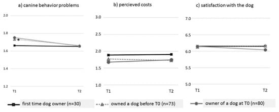 The pattern for perception of the costs of dog ownership did not change significantly over time between the three dog ownership groups (see Table 3 and Figure 3b). No differences between the three ownership groups were observed (at T1 or at T2; see Table S4). A contrast analysis revealed no significant decrease or increase between T1 and T2 in any of the groups (see Table S5).