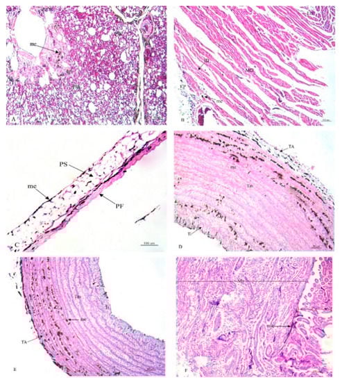 Histological location of melanin pigment in each organ; lung (A), heart (B), pericardium (C), aorta (D), brachial vein (E), kidney (F). Abbreviations: PW, parabronchial wall; VS, blood vessel; EP, epicardium; MD, myocardium; ED, endocardium; PF, fibrous pericardium; PS, serous pericardium; TA, tunica adventitia; Tm, tunica media; Ti, tunica interna; Cr, cortex; Mr, medulla; me, melanin pigment. Low magnification, H&E stain.