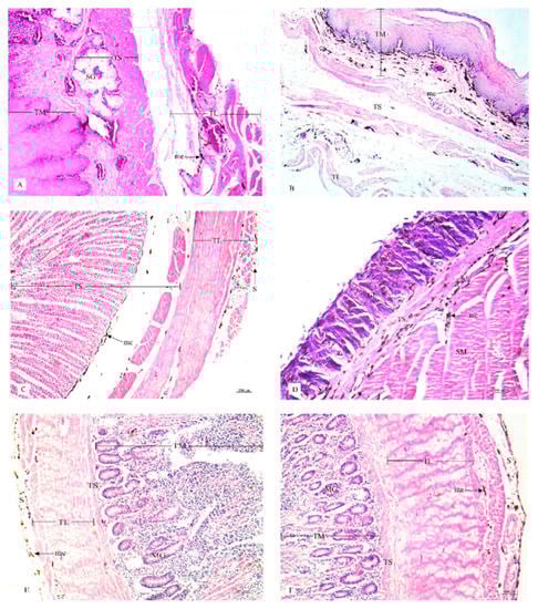 Our study has clearly shown that the layer-by-layer accumulation of the melanin pigment occurs in each tissue. Most tissue samples revealed melanin pigment accumulation in all layers; however, in some tissue samples, the melanin pigment was only found in specific layers. Conclusively, the melanin pigment is ubiquitous in various tissue layers and organs. However, the melanin pigment did not accumulate in the epithelial layer of the trachea, cloaca, oviduct, and gall bladder. Moreover, in the tunica mucosa of the gastrointestinal tract, i.e., esophagus, crop, jejunum, ileum, and cecum, melanin pigmentation was not observed. The epithelial layer and the tunica mucosa were located in the inner layer of the lumen of the organs; therefore, function was dependent upon the protection, absorption, and resorption processes of these organs [29,30]. The cell linings of most of these layers were unique and shared almost the same cell type. For example, the epithelium of the trachea was pseudostratified ciliated columnar with goblet cells, the gall bladder was columnar epithelium, the esophagus was stratified squamous epithelium or lined with epithelium columnar cells in the small intestinal and cecum regions [31]. The other layers were comprised of many cell types [31] for which the melanocytes could still remain within. In a previous study involving Silky fowls, it was also reported that the majority of the melanocytes were mainly present near blood vessels and in the muscle layer and outer membrane of the intestines [19].