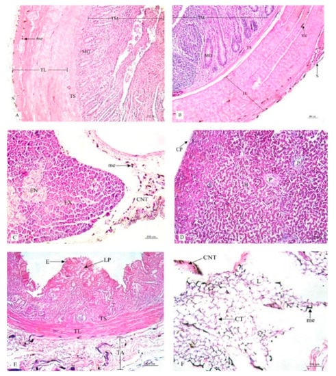 Histological location of melanin pigment in each organ; esophagus (A), crop (B), proventriculus (C), gizzard (D), duodenum (E), jejunum (F). Abbreviations: TL, tunica muscularis; TS, tunica submucosa; TM, tunica mucosa; SG, seromucous gland; S, tunica serosa; GL, granular layer; SM, muscular layer; MG, mucous gland; me, melanin pigment. Low magnification, H&E stain.