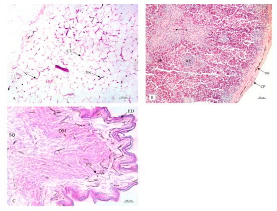 Histological location of melanin pigment in each organ; abdominal fat (A), spleen (B), skin (C). Abbreviations: CT, cytoplasm; N, nucleus; CP, capsule; RP, red pulp; WP, white pulp; A, central artery; ED, epidermis; DM, dermis; SQ, subcutis; me, melanin pigment. Low magnification, H&E stain.