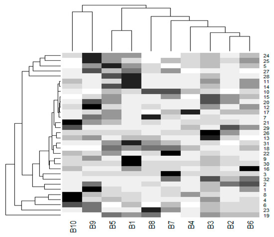 A dendrogram was prepared from the percentages of melanin pigment (mean values) found in 32 organs of each chicken. The cells are colored according to the percentage of melanin pigment. The highest melanin pigment is represented by the color black, while the lowest melanin pigment is presented in super light gray. A tree on the column represents a clustered group of chickens, while a tree on the row represents a clustered group of organs. (B-1-10, B1-5 were male subjects and B6-10 were female subjects). The liver, beak, comb, wattle, scale, and feathers were not included in this dendrogram. (1 = brain, 2 = spinal cord, 3 = sciatic nerve, 4 = larynx, 5 = trachea, 6 = syrinx, 7 = lung, 8 = heart, 9 = pericardium, 10 = aorta, 11 = brachial vein, 12 = kidney, 13 = cloaca, 14 = oviduct, 15 = testis, 16 = gastrocnemius muscle, 17 = femur, 18 = tongue, 19 = esophagus, 20 = crop, 21 = proventriculus, 22 = gizzard, 23 = duodenum, 24 = jejunum, 25 = ileum, 26 = cecum, 27 = pancreas, 28 = gall bladder, 29 = omentum, 30 = abdominal fat, 31 = spleen, 32 = skin).