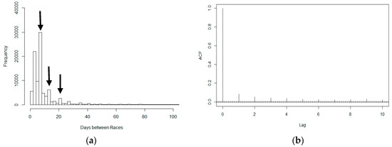 Frequency of racing, in terms of time between racing starts, in a cohort of 2393 racing greyhounds followed across 95,580 racing starts between the 2013 and 2016 seasons: (a) Frequency histogram of the number of days between consecutive races for individual greyhounds. The highest 1% of values have been removed. The arrows above the histogram demonstrate the peaks at 7 days, 14 days and 21 days respectively; (b) Autocorrelation function (ACF) showing the correlation in the raw residuals as a function of number of days between successive races for individual dogs. The dashed grey lines represent approximate 2-sided critical bounds for the autocorrelation at α = 0.01.