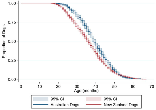 Summary measures for the age dogs finished their racing careers are presented in Table 2. There was a significant difference in finish age between New Zealand dogs (Median: 36 months, IQR: 29–43 months) and Australian dogs (Median: 39 months, IQR: 33–46 months) (p < 0.001). Dogs from Australia were significantly more likely to finish racing at a later age than New Zealand dogs (Log-rank p-value < 0.0001) (Figure 2).