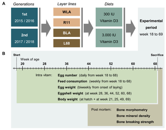 Schematic illustration of the experimental setup (A) and related data collection (B). In two consecutive generations, four chicken layer lines were allocated to a diet containing either 300 or 3000 IU of vitamin D3. During the experimental period, data on egg number, egg quality, feed consumption and body weight were collected as indicated. Post mortem, bone morphometry, bone mineral density and bone breaking strength were assessed.