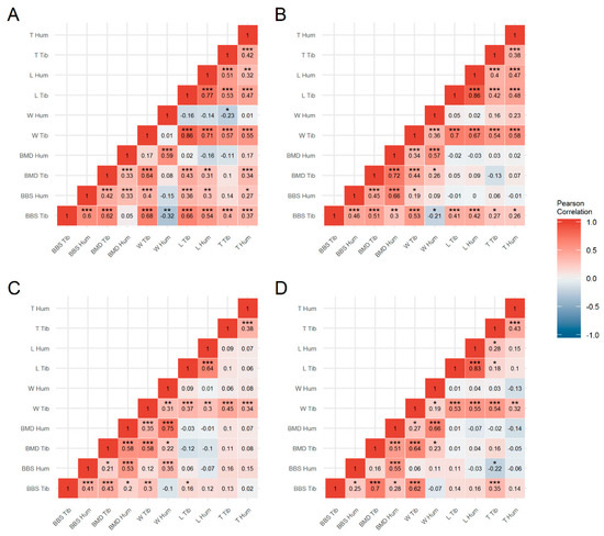 Heatmap of Pearson’s correlation coefficients between bone traits (BBS, bone breaking strength; BMD, bone mineral density; W, bone weight; L, bone length; T, bone thickness) of the tibiotarsus (Tib) and humerus (Hum) in laying hens of the genetic lines WLA (A), R11 (B), BLA (C) and L68 (D). Red indicates a positive correlation; white represents no correlation and blue represents a negative correlation. Significant correlation coefficients are marked with asterisks (* p < 0.05; ** p < 0.01; *** p < 0.001).