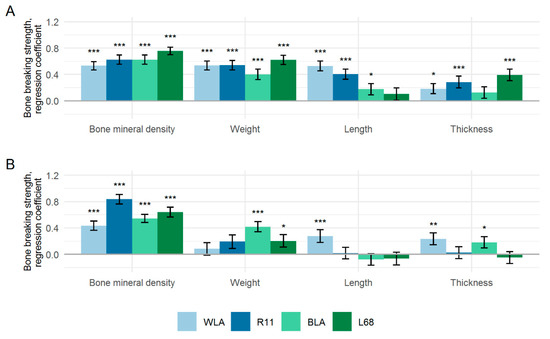 Standardised regression coefficients (β) ± standard errors of regression of bone mineral density, bone weight, bone length and bone thickness pertaining univariately to the bone breaking strengths of the tibiotarsus (A) and humerus (B) in four different chicken layer lines (WLA, R11, BLA, L68). Significant regression coefficients are marked with asterisks (* p < 0.05; ** p < 0.01; *** p < 0.001).