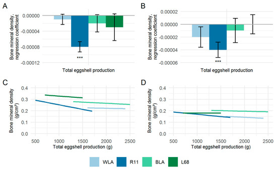 Regression coefficients (β) ± standard errors of regression of total eggshell production pertaining to the bone mineral densities of the tibiotarsus (A) and humerus (B), and the effect of total eggshell production on the bone mineral densities of the tibiotarsus (C) and humerus (D) in four different chicken layer lines (WLA, R11, BLA, L68). Significant regression coefficients are marked with asterisks (*** p < 0.001).