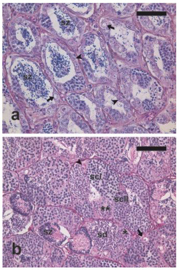 Micrographs of testis sections of meagre sampled in two periods of the reproductive cycle. (a) Testis section from a fish in post-reproductive state (mid-July 2017, Trial 1). The germinal epithelium is mainly constituted by spermatogonia and residual spermatozoa are visible in the lumen of the seminiferous lobules. (b) Testis section from a fish in active spermatogenesis (mid-March 2018, Trial 2) showing all stages of spermatogenesis. Haematoxylin–eosin (H-E) staining. Magnification bars = 50 µm. Arrows: large single A spermatogonia; arrowheads: small single A spermatogonia; asterisk: Type A spermatogonial cyst; double asterisk: Type B spermatogonial cyst; sd: spermatid cyst; scI: primary spermatocyte cyst; scII: secondary spermatocyte cyst; sz: spermatozoa.