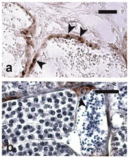 Among the four used antibodies, only anti-oct4 and anti-vasa, in Bouin’s solution-fixed samples, successfully labeled single intralobular cells (Figure 2a,b) located throughout the length of the seminiferous lobules, with a higher density at their blinded end.