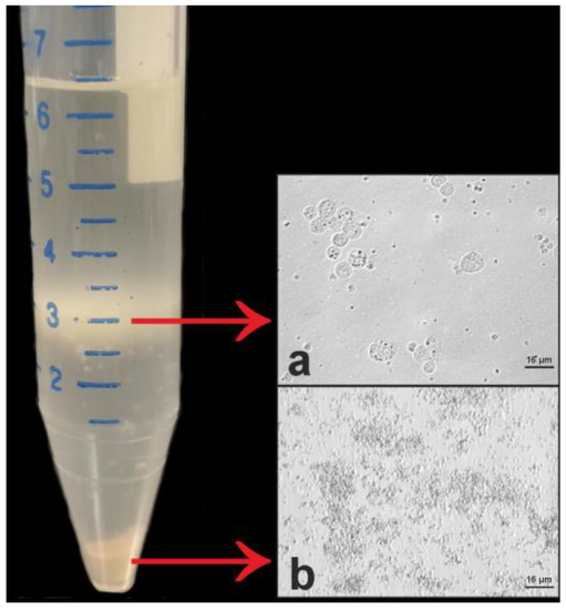 Isolation of meagre testicular cells by Ficoll–Paque PLUS gradient. The band (a) contained different cell types, including cells with size and appearance compatible with those of spermatogonial stem cells (SSCs). Cell debris together with putative spermatozoa and red blood cells were present in the pellet (b).