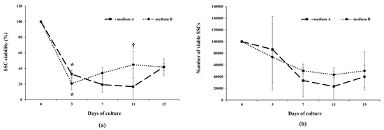 Meagre SSC viability was compared by chi-square test between two consecutive time intervals for Medium A, two consecutive time intervals for Medium B, and at the same time intervals for Medium A vs. Medium B. Differences in the number of viable meagre SSCs were evaluated via two-tailed Student’s t-test for the same groups.