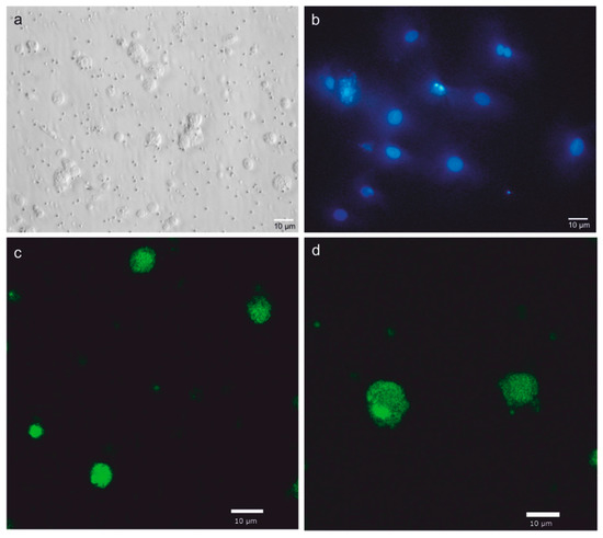The results of the immunofluorescence analysis showed that oct4 and vasa were expressed in meagre SSCs (Figure 6). The epifluorescence analysis revealed the presence of nucleated cells with small volumes of cytoplasm (Figure 6b). Confocal microscopy evaluation revealed that oct4-positive cells had nuclear diameters ranging between 7 and 9 µm, and vasa-positive cells were between 10 and 11 µm. Interestingly, oct4 (Figure 6c) and vasa (Figure 6d) were still expressed in SSCs after 14 days of culture. No signals were detected when using GFRA1 and Nanos2 antibodies.