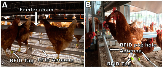 A picture showing the hens at the lower feeder tier (A) and the pop hole antenna (B). RFID = Radio-Frequency Identification.