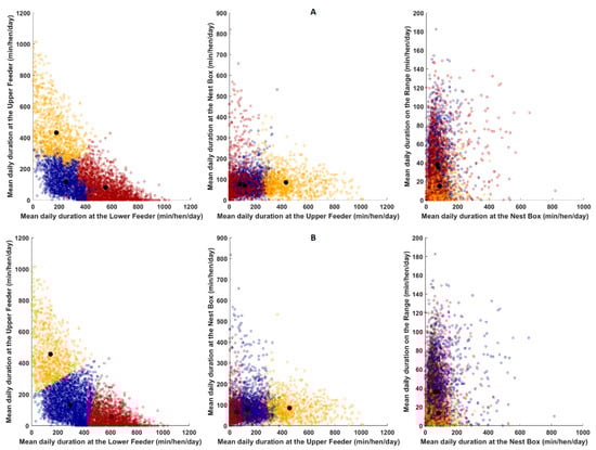 In K-means clustering method, hens of cluster 1 (n = 1470 hens) spent significantly more time on the upper feeding chain (498.0 ± 4.16 min/hen/day) compared to hens of cluster 2 (n = 3473; 143.8 ± 1.57 min/hen/day) and hens of cluster 3 (n = 2301; 46.28 ± 1.17 min/hen/day), respectively (p < 0.05). Hens of cluster 3 spent 648.5 ± 2.50 min/hen/day at the lower feeder chain compared to hens of clusters 1 and 2 (108.7 ± 2.28 and 302.4 ± 1.80 min/hen/day, respectively; p < 0.05). The hens from all the clusters spent least time at the range and at the nest box. Clusters 1 and 2 spent comparable time on the range (p > 0.05), while cluster 3 hens spent the least amount of time on range (6.18 ± 0.32 min/hen/day; p < 0.05). Similarly, using the agglomerative clustering method, hens of cluster 1 (n = 979 hens) spent significantly more time on the upper feeding chain (571.8 ± 4.60 min/hen/day) compared to hens of cluster 2 (n = 3501; 178.7 ± 1.94 min/hen/day) and hens of cluster 3 (n = 2764; 55.3 ± 1.11 min/hen/day), respectively (p < 0.05). Hens of cluster 3 spent 611.7 ± 2.6 min/hen/day at the lower tier feeder chain compared to hens of clusters 1 and 2 (88.9 ± 2.45 and 264.1 ± 1.86 min/hen/day, respectively; p < 0.05). The hens from all the clusters spent the least time at the range and at the nest box. Clusters 1 and 2 spent comparable time on the range (p > 0.05), while cluster 3 hens spent the least amount of time on range (4.8 ± 0.36 min/hen/day; p < 0.05).