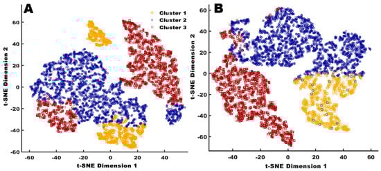 Two-dimensional scatter plot of t-Distributed Stochastic Neighbor Embedding (t-SNE) visualizing cluster assignments of individual hens by agglomerative (A) and K-means algorithm (B), where cluster 1 hens (orange circles), cluster 2 hens (dark blue star), and cluster 3 hens (dark red square), grouped according to their similarity of time duration at the feeders, nest boxes, and on the range.