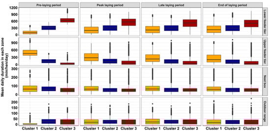 The box plots represent the time duration that hens of each cluster spent on the different tiers from during pre-laying period (18–22 weeks), peak-laying period (23–33 weeks), late laying period (34–54 weeks), and end of laying period (55–74 weeks) based on the K-means analysis.