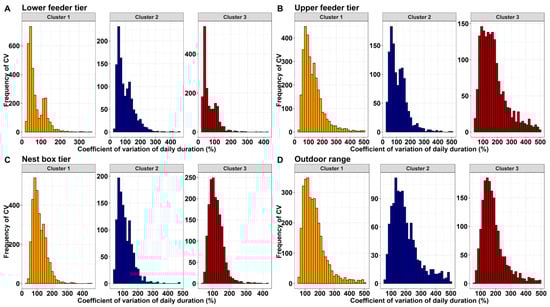 Frequency histograms of the CV for daily duration and number of visits to the range in cluster 1 (orange), 2 (dark blue), and 3 (dark red) for free-range laying hens based on the K-means cluster analysis for lower feeder zone (A), upper feeder zone (B), nest box (C) and outdoor range (D).