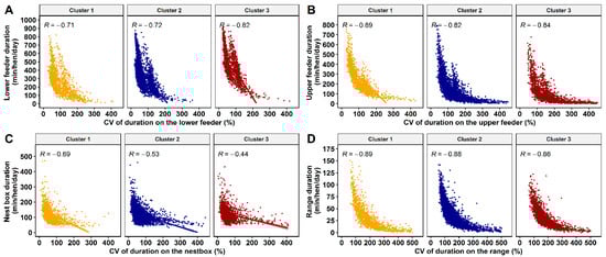 The correlation between the CV of daily mean average duration and the daily mean average duration on the different the feeders, nest boxes, and on the outdoor range of the K-means clusters is illustrated in Figure 6. Overall, the mean daily duration that hens accessed the lower feeder tier, upper feeder tier, nest box tier, and outdoor range was negatively correlated with the CV for the daily duration (Spearman’s rho = −0.66, −0.84, −0.55, and −0.88, p < 0.001), respectively. The CV of daily mean average duration and the daily mean average duration at the nest box had the lowest negative correlation coefficient compared to all other areas (Figure 6).