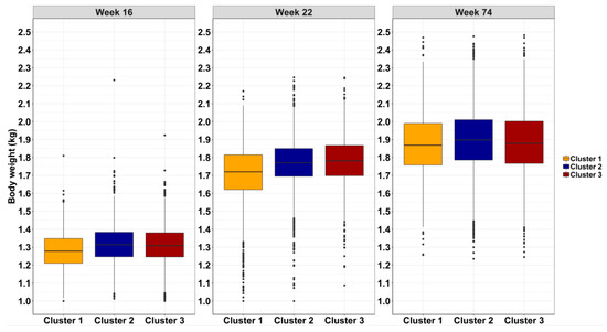 The box plots represent the body weight at 16, 22, and 74 weeks of age for cluster 1 (orange), cluster 2 (dark blue), and cluster 3 (dark red color). The lines on the box plot represent the lower quartile, median, upper quartile, and the interquartile range of body weight of each cluster based on the K-means solution.