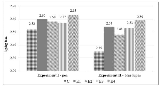 In both experiments, very good production results were achieved by all fatteners regarding daily body weight gains, feed conversion ratio and meatiness. The growth rate and feed conversion ratio of growing pigs have significantly increased in recent years []. Improvement of pure-bred pigs of dam and sire breeds caused that the hybrid pigs usually achieve even higher production results than the pure-bred animals (heterosis effects). The high genetic potential of the pigs regarding their productive traits and the high-quality balanced feed mixtures with pea seeds (5.0%–17.5%) or blue lupin seeds (5.0%–17.5%) administered to them allowed achieving high production results in the present study.