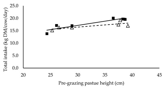 | Total intake (kg DM/cow/day) | 0.80 | 6.93 | 0.340 ** | 11.28 | 0.173 * |