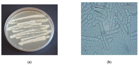 Macroscopic (a) and microscopic (b) features of Geotrichum candidum. (a): White, dry, powdery to cottony colonies of Geotrichum candidum. (b): Hyaline septate hyphae breaking up into chains of hyaline, smooth, one-celled, sub-globose to cylindrical arthroconidia (6–12 × 3–6 µm in size).