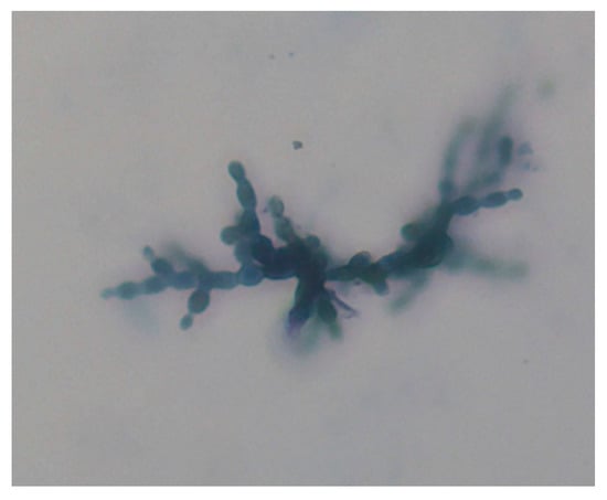 Geotrichum spp. are yeast-like fungi, commonly isolated from soil, air, water, milk, silage, and plant tissues and can be isolated from the digestive tract, skin, vagina, and mouth of humans and other mammals [20,21]. In some cases, this fungus can be pathogenic, producing disseminated or localized skin disease in both humans and animals [22,23,24]. There are 13 species of Geotrichum but Geotrichum candidum is one of the most important species reported to cause infection in animals [20,21]. Geotrichum candidum was isolated in 28.1% of the horses in a retrospective study of 64 horses presenting with skin lesions referable to fungal infection [6]. That study identified that the age of affected horses was a risk factor, with horses aged between 3 and 17 years more likely to become infected and develop lesions. The horse in the current study was 11 years old, so was within the age range described in the retrospective study. Figueredo et al. [6] reported that the head and neck regions were the most common regions affected with fungal dermatitis, whilst legs and tails were less likely affected. The current horse had severe alopecia particularly affecting the head and neck regions, which likely represented primary areas of infection, in agreement with the literature [6] and then, the fungus likely migrated or was spread to other parts of the body. In the retrospective study by Figueredo et al. [6] only 1/12 horses had generalized skin geotrichosis, similar to the current case, but details of the case were not described. This study is therefore useful to educate veterinarians on how to diagnose generalized Geotrichum candidum infection in horses.