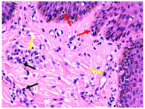 Skin histopathology from a horse with severe dermatitis, showing mild lymphocytic, hyperplastic dermatitis (H.E. 40× objective). Black arrows highlight perivascular inflammatory cells; yellow arrows highlight plump endothelial cells of dermal capillaries; red arrows highlight leucocytes in epithelium.