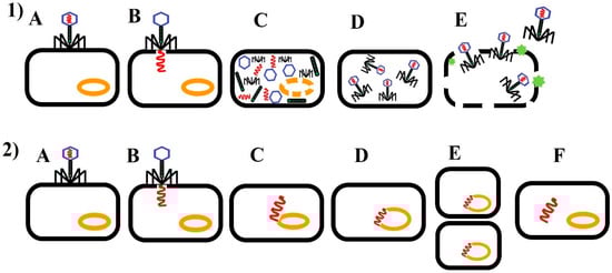 In contrast, the lysogenic cycle does not result in the lysis of the host cell and progeny production. Instead, it leads to the integration of phage genetic material into the bacterial genome, and its, transmission into new cells (after cell division). The dormant phage is known as a prophage or endogenous phage (a latent form of phage). Under abnormal environmental conditions, the phage can become active and enter the lytic stage [10,11] (Figure 1).