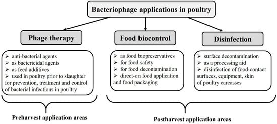 In the past decades, the emergence of multidrug antibiotic-resistant bacteria (MDR) has been reported as a result of too common and frequent use of antibiotics in human and veterinary medicine as well as in industry and agriculture. Moreover, MDR can be transmitted from food-producing animals to humans via direct contact between animals and humans, or through the food chain and the environment [13,14]. In the face of a loss of life-saving antibiotics and the lack of new ones, researchers have started the search for alternative means of fighting bacterial pathogens, such as vaccines, probiotics, prebiotics, bacteriophages, nanoparticles, antimicrobial peptides (AMPs), or anti-virulence compounds. There has been an explosion of research and interest in the usage of bacteriophages in the poultry veterinary medicine and the poultry industry. Thus, in turn, new companies developing bacteriophage preparations have appeared on the global market. Examples of phage applications in poultry farming, processing, and production are shown in Figure 2.