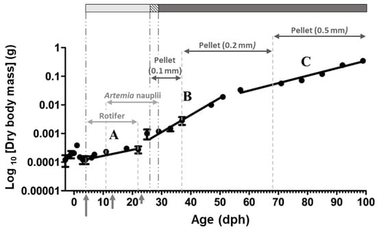 Sarasquete et al. [] divided the early growth of the thick-lipped grey mullet (the same fish stock as the present study) into three different periods. (A) From 5 dph to 22 dph, period of slow growth (growth rate 3.93% per day), (B) from 22 dph to 54 dph, period of fast growth (growth rate 13.45% per day), and (C) from 54 dph to 99 dph, period of intermediate growth (growth rate 6.81% per day) (Figure 1).