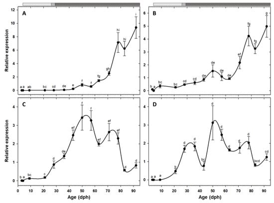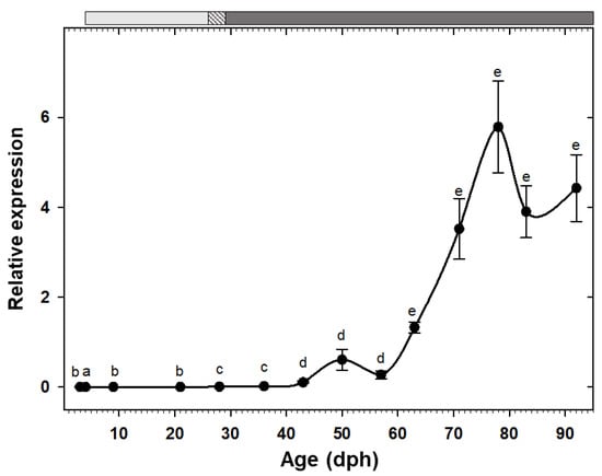 Expression of igf1 was relatively low during initial stages and after a peak at 50 dph, it was maintained at high levels during the rest of the sampling points. The significant increase of igf1 expression in the late larval stages could be linked to numerous processes that are involved in the transition to the juvenile stage [,,]. The fundamental role of Igf1 on growth, differentiation, and morphogenesis has been described in different vertebrates [,], including during acclimation process of this species to rearing condition at early life stages (101 dph) [].
