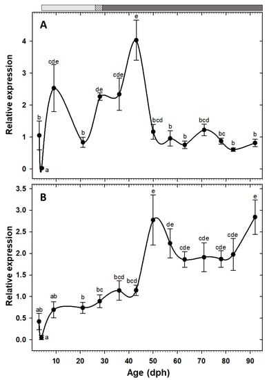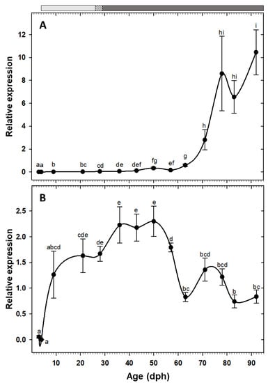 The somatotropic factors exhibited opposite patterns (Figure 5). Expression of gh increased significantly at 9 dph and maintained the high values, with an exceptional decrease at 21 dph, until reaching to maximum levels at 43 dph. Posteriorly, expression of this gene decreased significantly and maintained relatively low levels during the rest of the study period (Figure 5A). Nevertheless, igf1 showed a gradual increasing tendency from early days, but it did not reach to the maximum level until 50 dph, beyond which the values were relatively constant until the end of the study (Figure 5B).