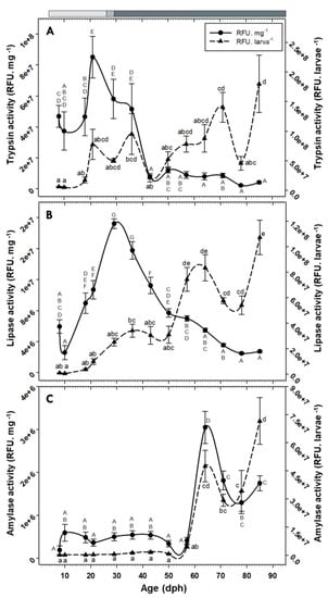 No pepsin or chymotrypsin activities were detected in individuals of C. labrosus at the evaluated ages. In contrast, activities of trypsin and lipase increased over time and exhibited maximum levels in older fish. The activity of these enzymes per mg dry body mass showed a general increasing trend at the beginning of the study (maximum levels at 21 dph and 29 dph, respectively) but dropped significantly afterward (Figure 6A,B). Amylase activity, either per larva or per mg dry body mass, showed low and stable levels until 57 dph but increased drastically from that age onward (Figure 6C).