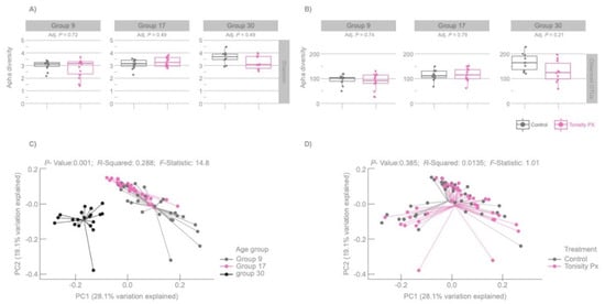 Shannon diversity index (A), alpha-diversity observed Operational Taxonomic Units OTUs (B), and beta-diversity (weighted UniFrac) of gut microbiota communities in piglets at 9, 17, and 30 days of age (C) and in Control and piglets supplemented with Tonisity Px (D).