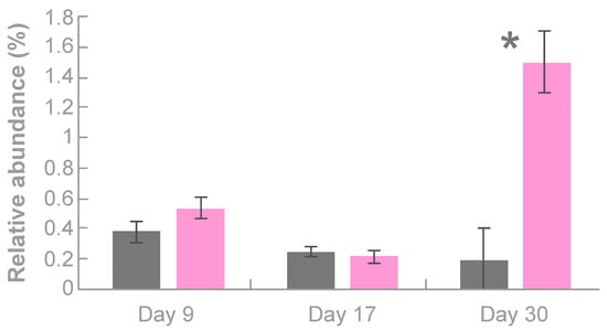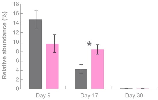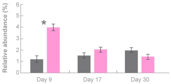Relative abundance (%) of Streptococcus species in the gut of 9-, 17-, and 30-day-old piglets in the control (grey bars) and supplemented with Tonisity Px (pink bars) groups. Bars represent LSmeans and error bars denote ± SEM. * Indicates statistical significance between treatments at p < 0.05.