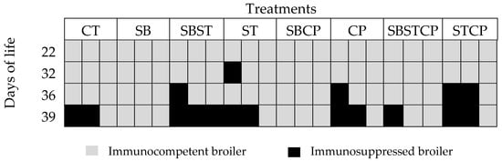 Body weight (BW) of each bird was measured weekly. Four sampling times were scheduled with three replicas from each treatment at 22, 32, 36 and 39 days of life. Broilers were euthanized by intraperitoneal injection of 3 mL per 2.5 kg of broiler, 6.3% sodium pentobarbital (PISA Agropecuaria, Guadalajara, Mexico). Cardiac puncture was performed to obtain blood samples [], which were deposited in collection tubes with coagulation activator applied by spraying (red cap—BD Vacutainer) and centrifuged at 1600× g for 10 min to separate the serum, which was aliquoted and stored at −20 °C for later analysis []. Subsequently, broilers were eviscerated, and their bursa, spleen and thymus were removed.