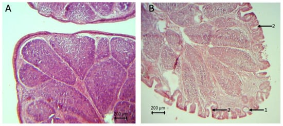 Histopathological lesions in the bursa of broilers challenged with S. typhimurium and C. perfringens. (A): Bursa without apparent lesions (control group) (4×). (B): (1) intraepithelial mucosal cysts, (2) epithelial invaginations (S. typhimurium + C. perfringens) (4×).