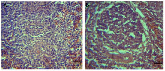 The development of lymphoid tissues can reflect the immune system response and functionality. Bursa of Fabricius, spleen and thymus are the main immune organs involved in humoral and cell immunity of animals []. Bursa of Fabricius is required for B-cell development, the function of spleen, the biggest peripheral immune organ, is involved in the chicken’s immune reaction, and thymus is the site of T-cell maturation [,].