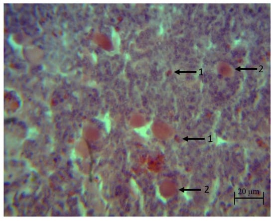 Histopathological injuries in the thymus of broilers challenged with S. typhimurium and C. perfringens (100×). (1) heterophiles (2) reticular epithelial cells (S. typhimurium + C. perfringens)