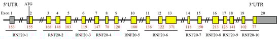 Structure of the porcine RNF20 gene. Ten fragments used for PCR amplification are shown. This gene is organized into 20 exons (box) and 19 introns (horizontal lines). The left and right gray boxes represent the 5′- and 3′-UTRs, respectively.