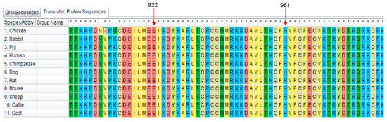 To further investigate the molecular characterization of the porcine RNF20 gene, bioinformatic analysis was performed based on the CDS sequence. The CDS encodes 975 amino acid residues with a predicted molecular mass of 113.8 kDa and the pI of 5.74. The CDS shared 92.5% amino acid identity with human RNF20 (NM_019592.7) and 89.3% with mouse RNF20 (NM_001163263.1). Furthermore, a comparative phylogenetic tree was built with the RNF20 amino acid sequences across different species. As shown in Figure 2, the N-J phylogenetic tree was clustered into two groups: mammalian and poultry. This result indicated that porcine is most adjacent to sheep, goat, and cattle, according to the difference of genetic distance and junction point. It has been reported that RNF20 contains a RING domain, which is located at residues 922-961 at the C terminus. The alignments of the RING domain from 11 species are shown in Figure 3, suggesting that the sequences of the RING domain were highly conserved during evolution.