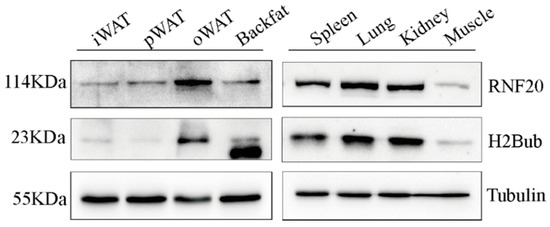 Tissues used for Western blot are from a 6-month-old Meishan pig and kept in our lab. Total protein was extracted from spleen, lung, kidney, muscle, inguinal white adipose tissues (iWAT), perirenal white adipose tissues (pWAT), omental white adipose tissues (oWAT), and backfat tissues using T-PER™ Tissue Protein Extraction Reagent (Thermo Scientific, Waltham, MA, USA). Proteins were resolved with 10% Tris/glycine SDS-PAGE transferred to nitrocellulose membrane (Merck Millipore, Billerica, MA, USA) blocked with 5% fat-free milk for 2 h at temperature and incubated overnight at 4 °C with the following antibodies: RNF20 rabbit polyclonal antibody (catalog no. 21625) was purchased from Proteintech (Chicago, IL, USA), H2Bub antibody (catalog no. 5546) and β-tubulin antibody (catalog no. 2146) were purchased from Cell Signaling Technology (Danvers, MA, USA), and finally, horseradish peroxidase-conjugated secondary antibody (catalog no. 7074) was incubated for 40 min at room temperature. Western blot substrate was detected with a Tanon imaging system.
